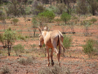 Die Kamele wurden 1920 als Arbeitstiere hier eingefuehrt. Spaeter wurden ca. 20.000 von ihnen in die Wildnis entlassen, und mittlerweile haben sie sich auf 1 Million vermehrt.
