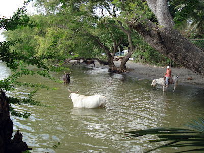 Der Playa Venecia auf der Suedseite der Insel dient aufgrund des Hochwassers aktuell eher den Pferden und Rindern als Badestelle.