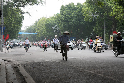 Aktuell sind wir in Ninh Binh, einer kleinen Stadt ca. 90 km entfernt von Hanoi. Sie wurde uns als sehr ruhig und entspannt beschrieben, was zwar im Allgemeinen stimmt, jedoch fuer die Hauptstrassen keineswegs zutrifft. Der Verkehr ist hier aehnlich chaotisch wie schon in Hanoi, und vielleicht kann eine kurze Szene, die wir dort beobachten konnten, es am besten zeigen: