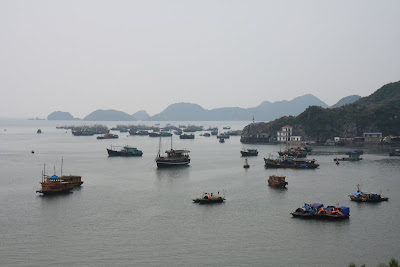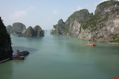 Vorgestern waren wir in der Halong-Bucht, die zu den Finalisten bei der Wahl zu den neuen Weltwundern und auch zum UNESCO-Weltnaturerbe zaehlt. Bislang kannten wir sie nur von Bildern, aber erst nachdem wir fast einen gesamten Tag damit verbracht haben, uns von einem Boot aus einen Teil der etwa 2.000 Kalkfelsen anzusehen, konnten wir die Erhabenheit dieser Szenerie erfassen. Naturgruenes Wasser, einmalige Felsformationen, und dazwischen kaum mehr als ein paar einheimische Fischer mit ihren traditionellen Holzbooten.
